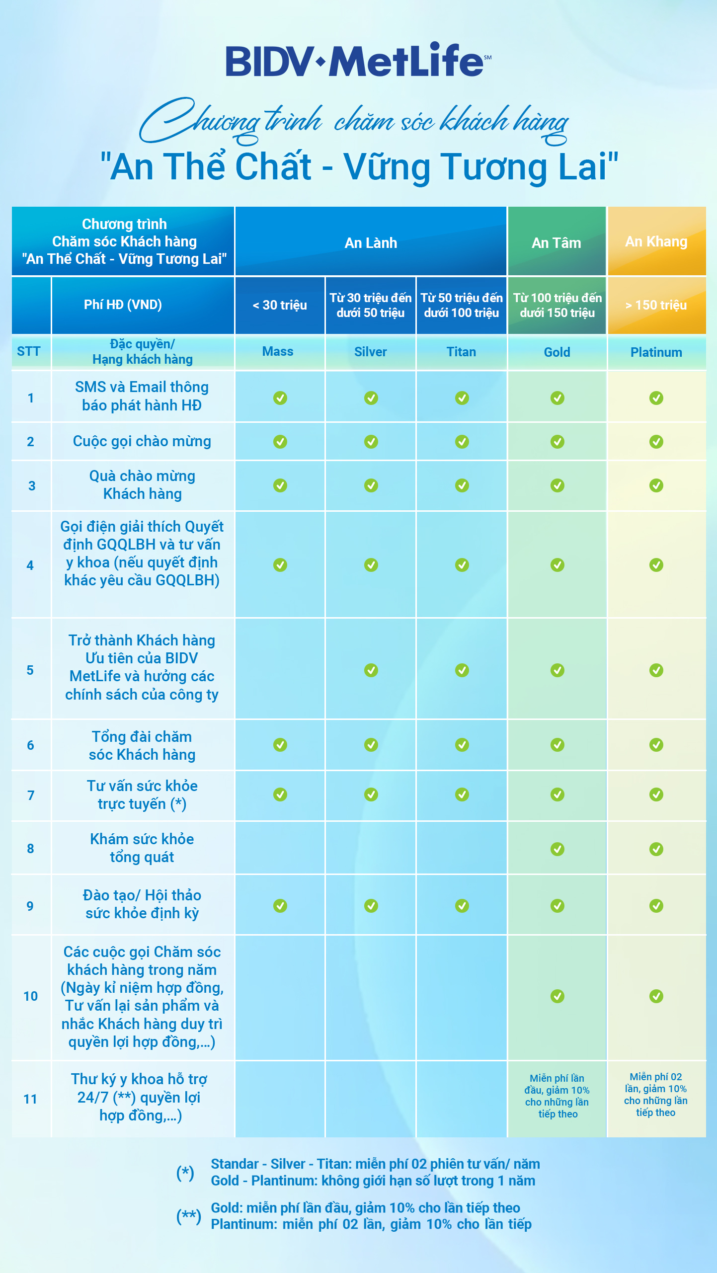 Với mong muốn mang đến trải nghiệm trọn vẹn cho từng nhu cầu cuộc sống của khách hàng, BIDV MetLife hân hạnh giới thiệu chương trình "An Thể Chất - Vững Tương Lai" chương trình chăm sóc đặc biệt dành riêng cho khách hàng.