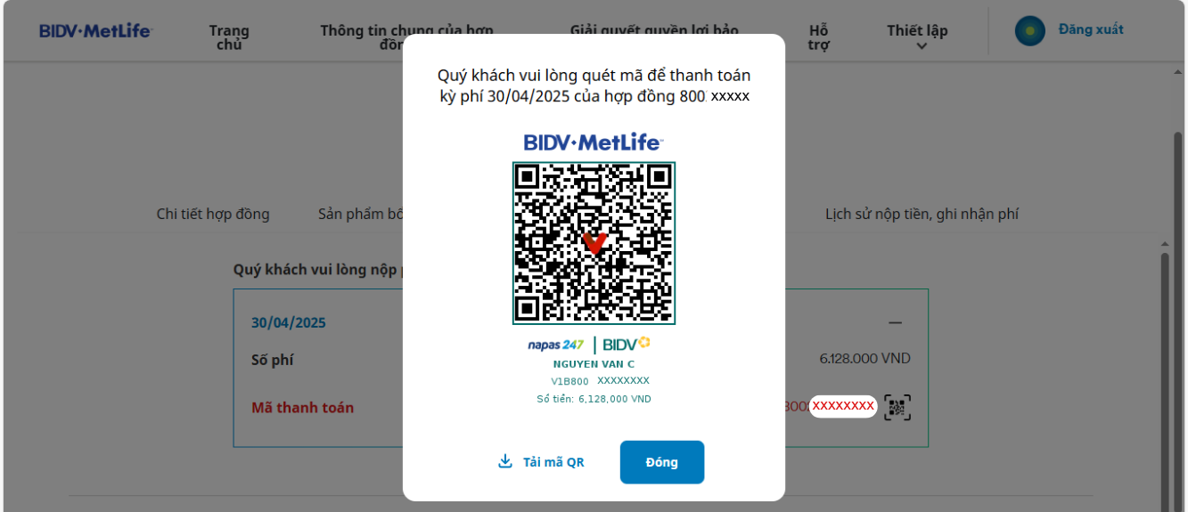 Bước 5: Quét mã QR để thanh toán (mã QR đã có thông tin số Hợp đồng bảo hiểm và tên Bên mua bảo hiểm)